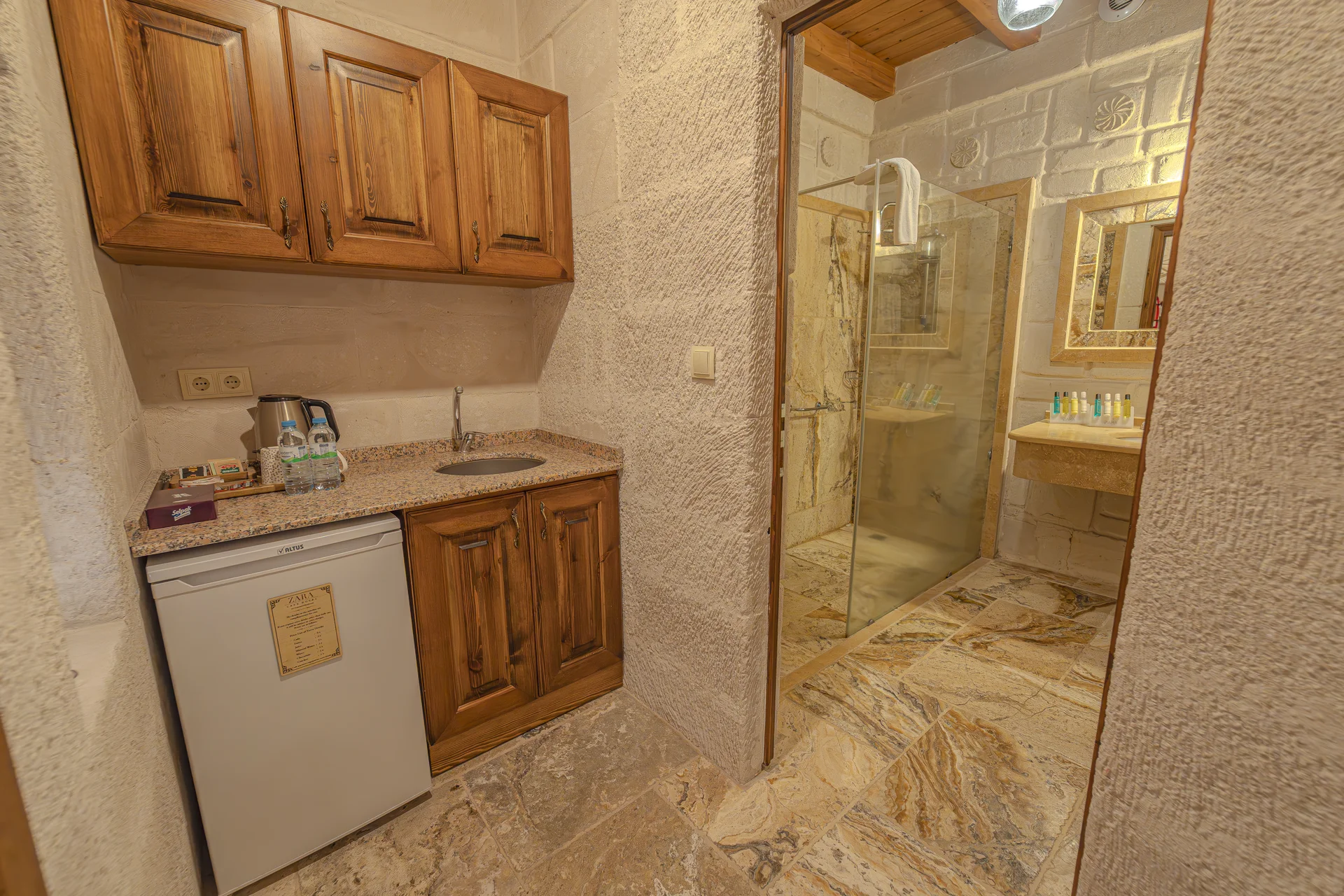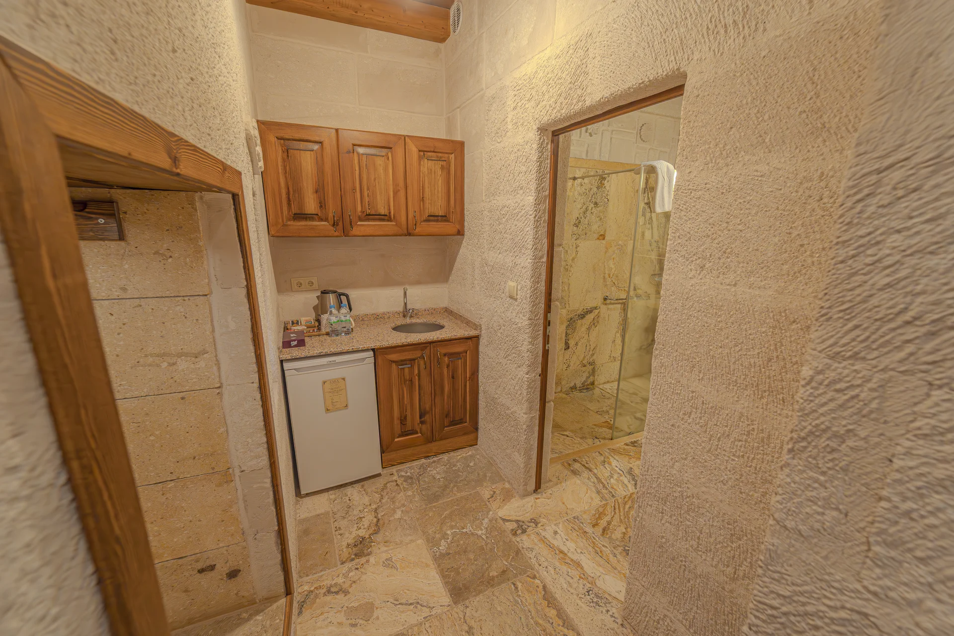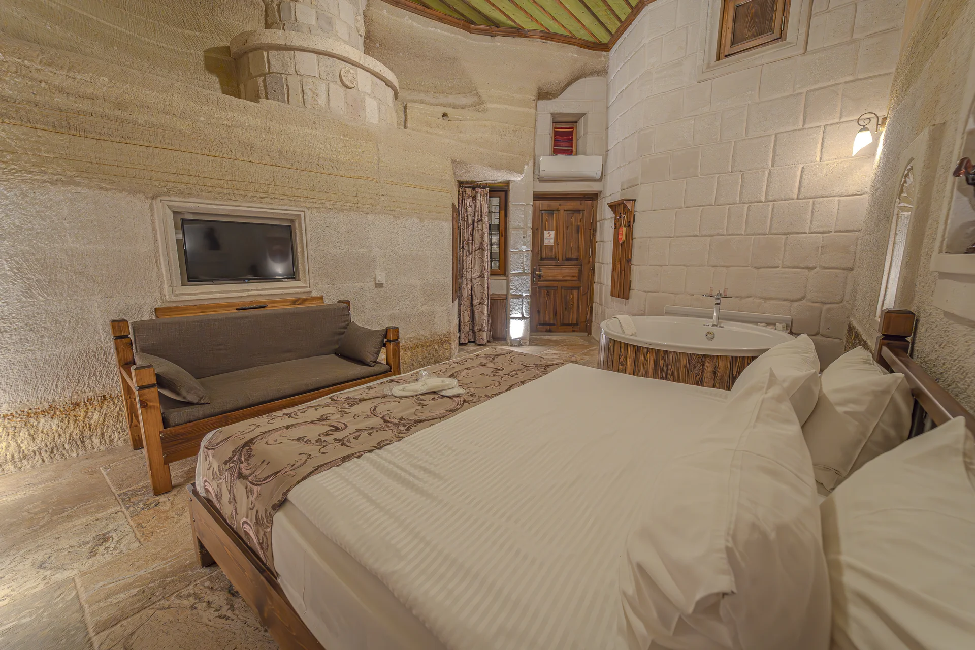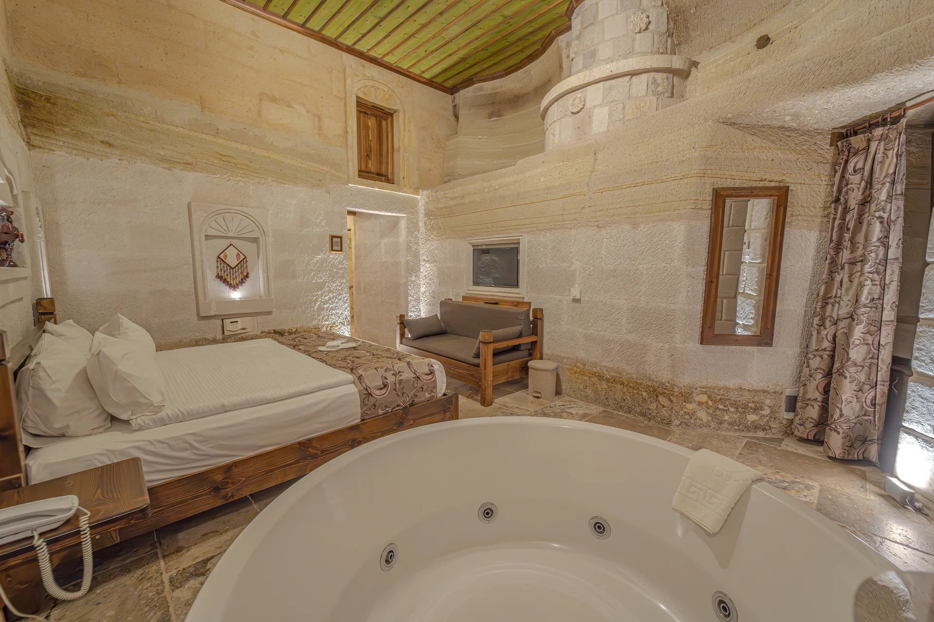 Oda, konaklamanız boyunca mükemmel konfor için yerden ısıtma sistemi ile donatılmıştır. 28 m²'lik düzeni ve özel jakuzi ile bu mağara odası, 2 misafiri lüks içinde ağırlayabilir ve Kapadokya'da romantik mağara otel deneyimi arayan çiftler için idealdir.