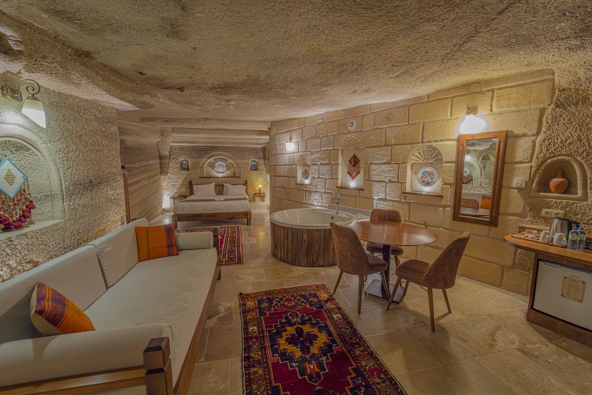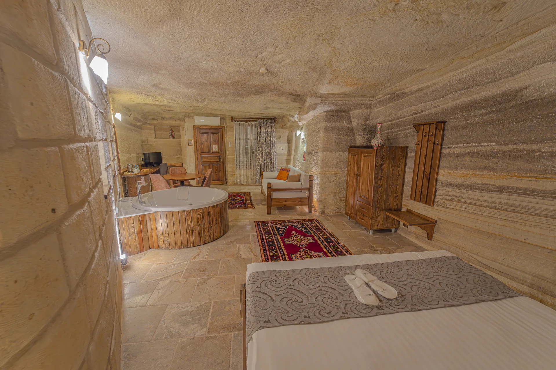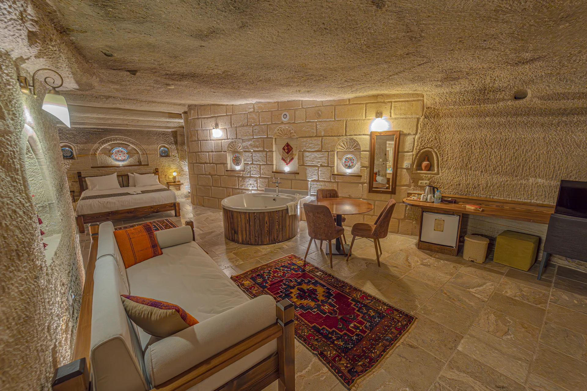 Oda, konaklamanız boyunca en üst düzey konfor için yerden ısıtma sistemi ile donatılmıştır. 38 m²'lik geniş düzeni, king size yatak ve özel jakuzi ile bu mağara odası, 2 misafiri lüks içinde ağırlayabilir ve Kapadokya'da unutulmaz romantik mağara otel deneyimi arayan çiftler için mükemmeldir.