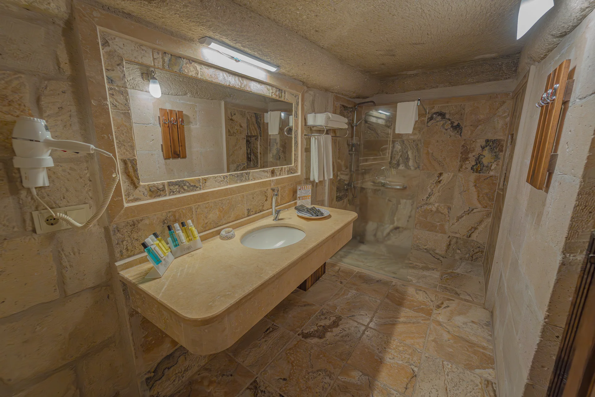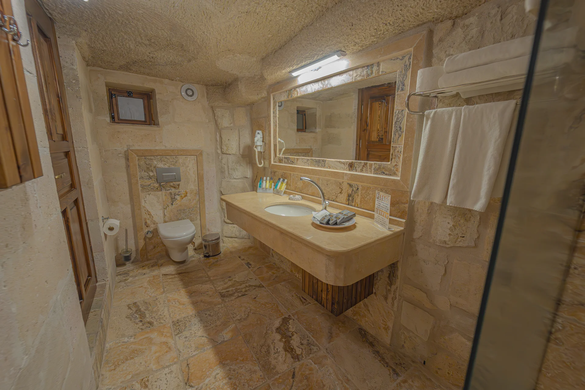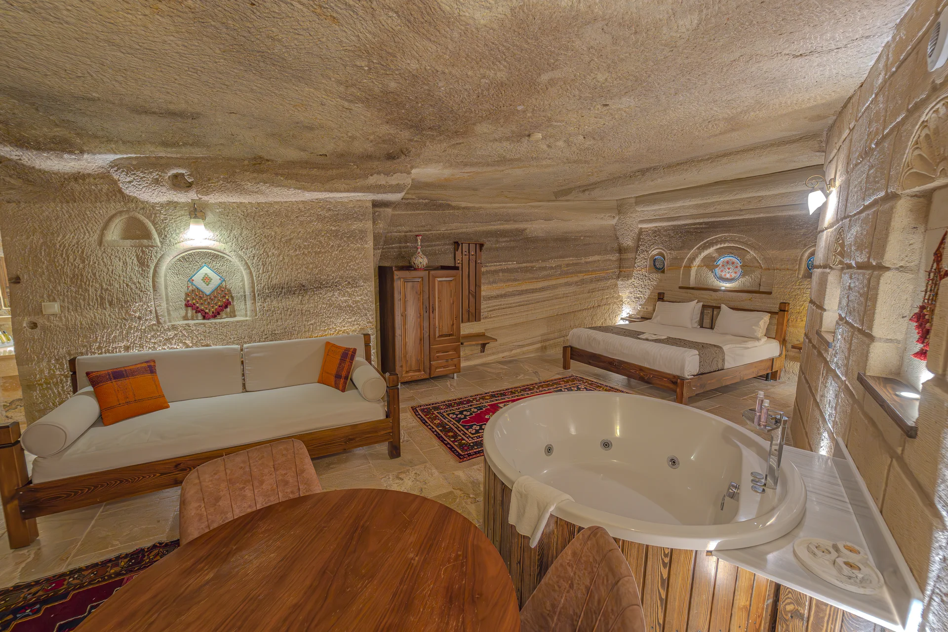 Oda, konaklamanız boyunca en üst düzey konfor için yerden ısıtma sistemi ile donatılmıştır. 38 m²'lik geniş düzeni, king size yatak ve özel jakuzi ile bu mağara odası, 2 misafiri lüks içinde ağırlayabilir ve Kapadokya'da unutulmaz romantik mağara otel deneyimi arayan çiftler için mükemmeldir.