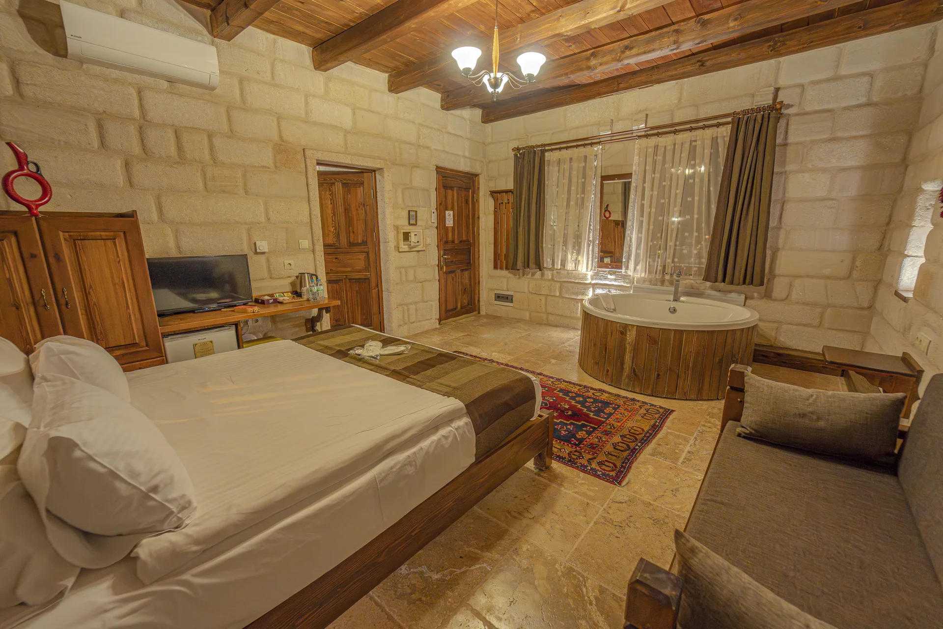 Odamız yerden ısıtma sistemi ile ısıtılmaktadır. Oda büyüklüğü 32 m²'dir ve özel jakuzi ile donatılmıştır. Konaklama için maksimum kapasite 2 kişidir, romantik taş oda deneyimi arayan çiftler için idealdir.