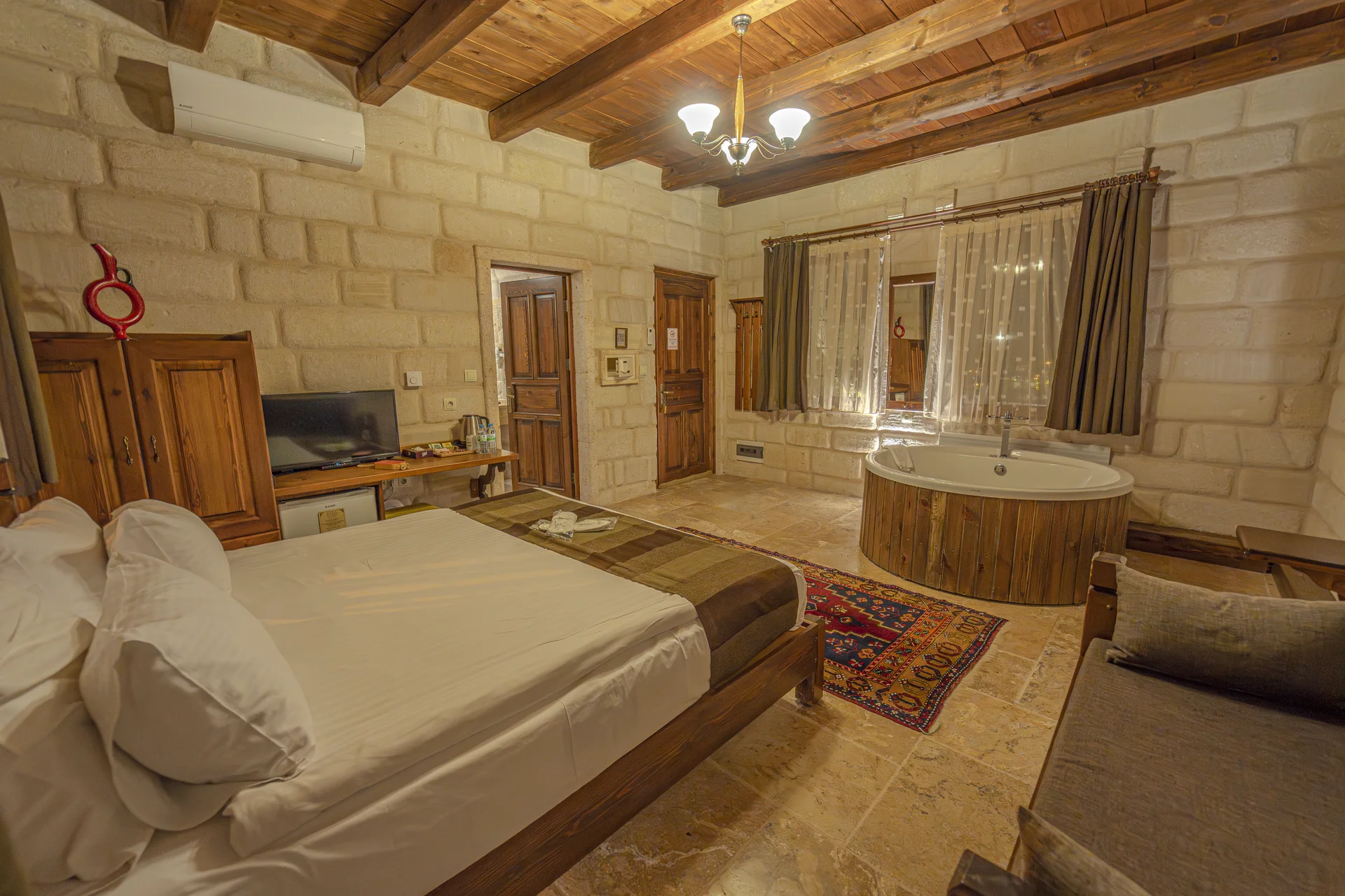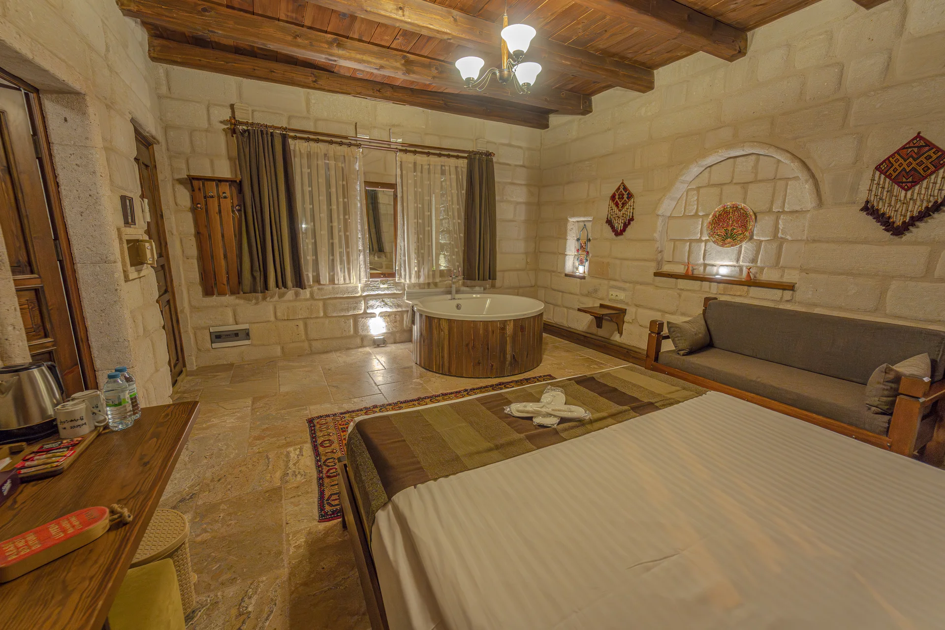 Kapadokya'da, Göreme'de bulunan bu jakuzili süperior taş oda, bölgeye özgü taşlarla inşa edilmiş olup lüks jakuzi ile dikkat çekmektedir. Bu premium konaklama, geleneksel Kapadokya taş işçiliğini jakuzi ile birleştirerek misafirlere romantik ve rahatlatıcı bir taş oda deneyimi sunar.